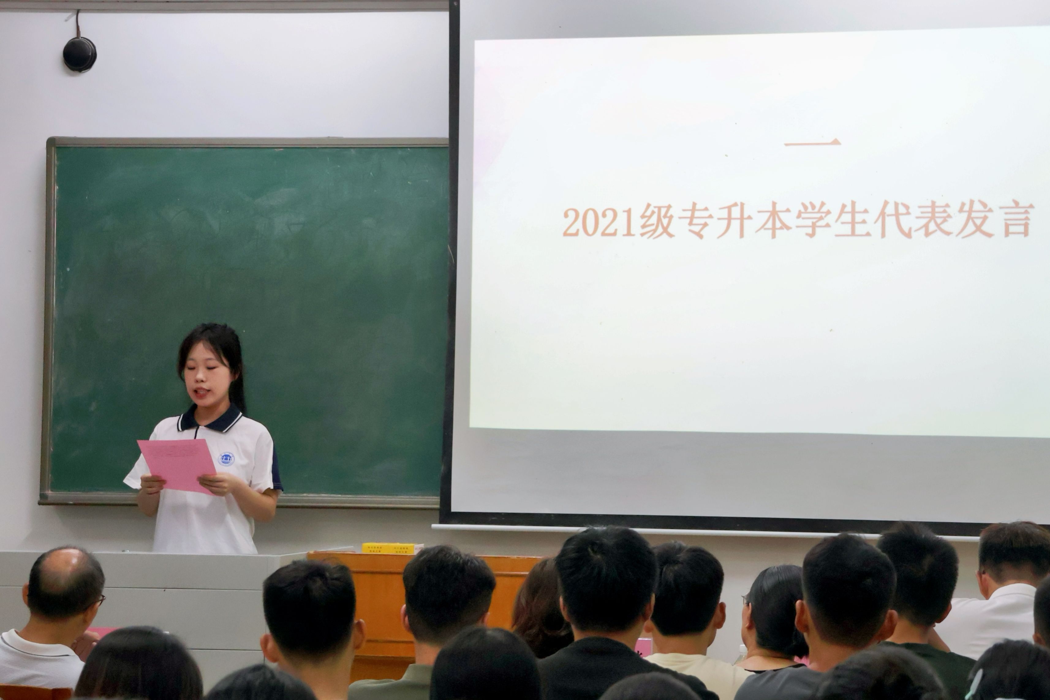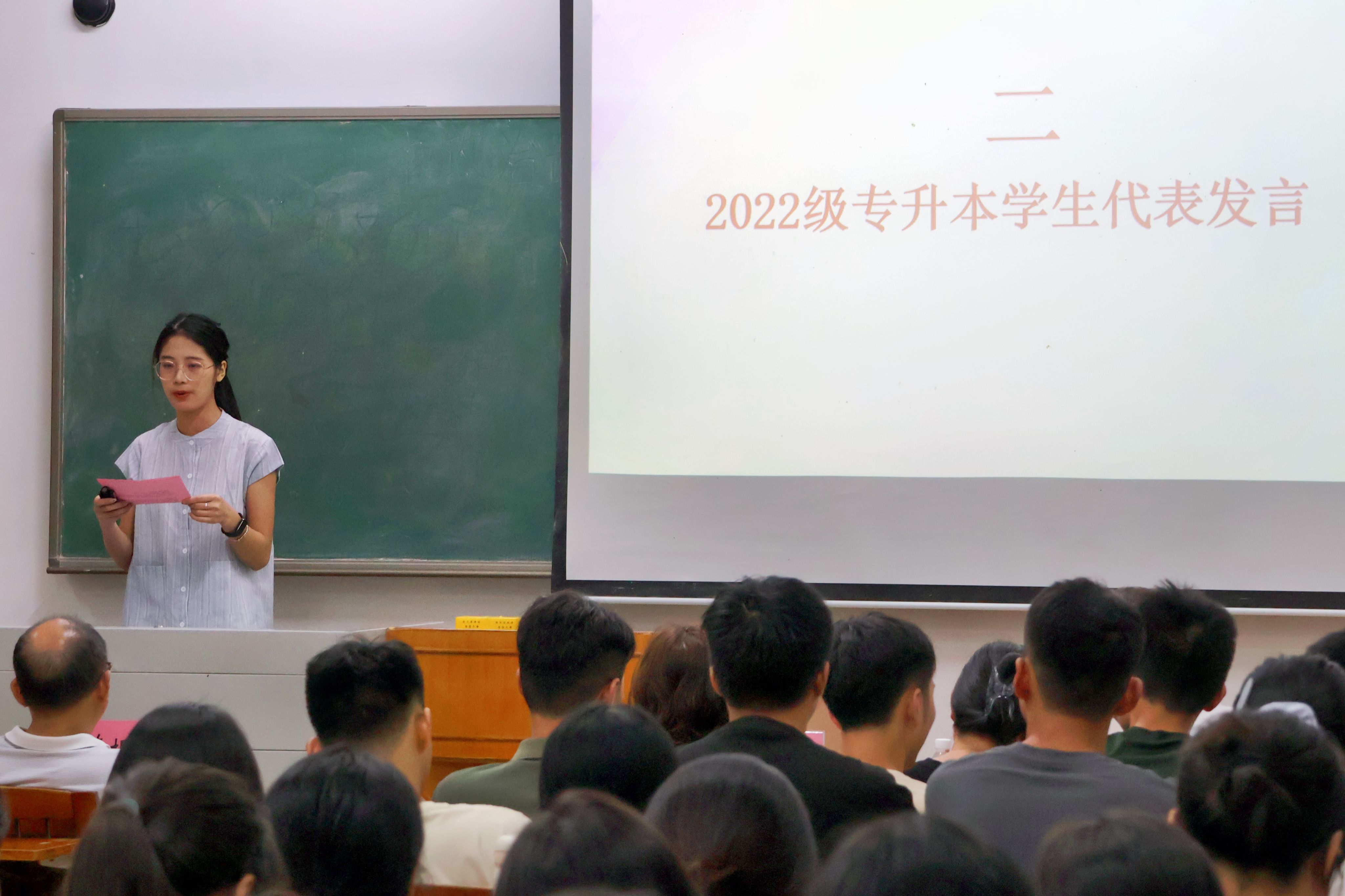学院党委书记蔡振治致辞。他向专升本新生介绍了学院的发展历程、师资力量、所获荣誉、学生规模等具体情况。蔡书记还对新生提出了三点希望与要求:一是心怀感恩,志存高远。他表示新生们有机会继续深造,这得益于党和国家的政策支持,希望新生们能心存感恩,志存高远,做好学习规划,珍惜在校学习的时间,同时鼓励大家积极报考研究生,不断提升自我。二是脚踏实地,行稳致远。他表示“新的开始,既是机遇,也是挑战”,希望新生们能夯实理论基础,积极参加各项专业技能竞赛和志愿活动,不断加强科学研究,提升自我综合素质。三是勇担使命,荡涤情怀。蔡书记希望新生能够大力弘扬教育家精神,牢记为党育人、为国育才的初心使命,树立“躬耕教坛、强国有我”的志向和抱负,自信自强、踔厉奋发,为强国建设、民族复兴伟业作出新的更大贡献。