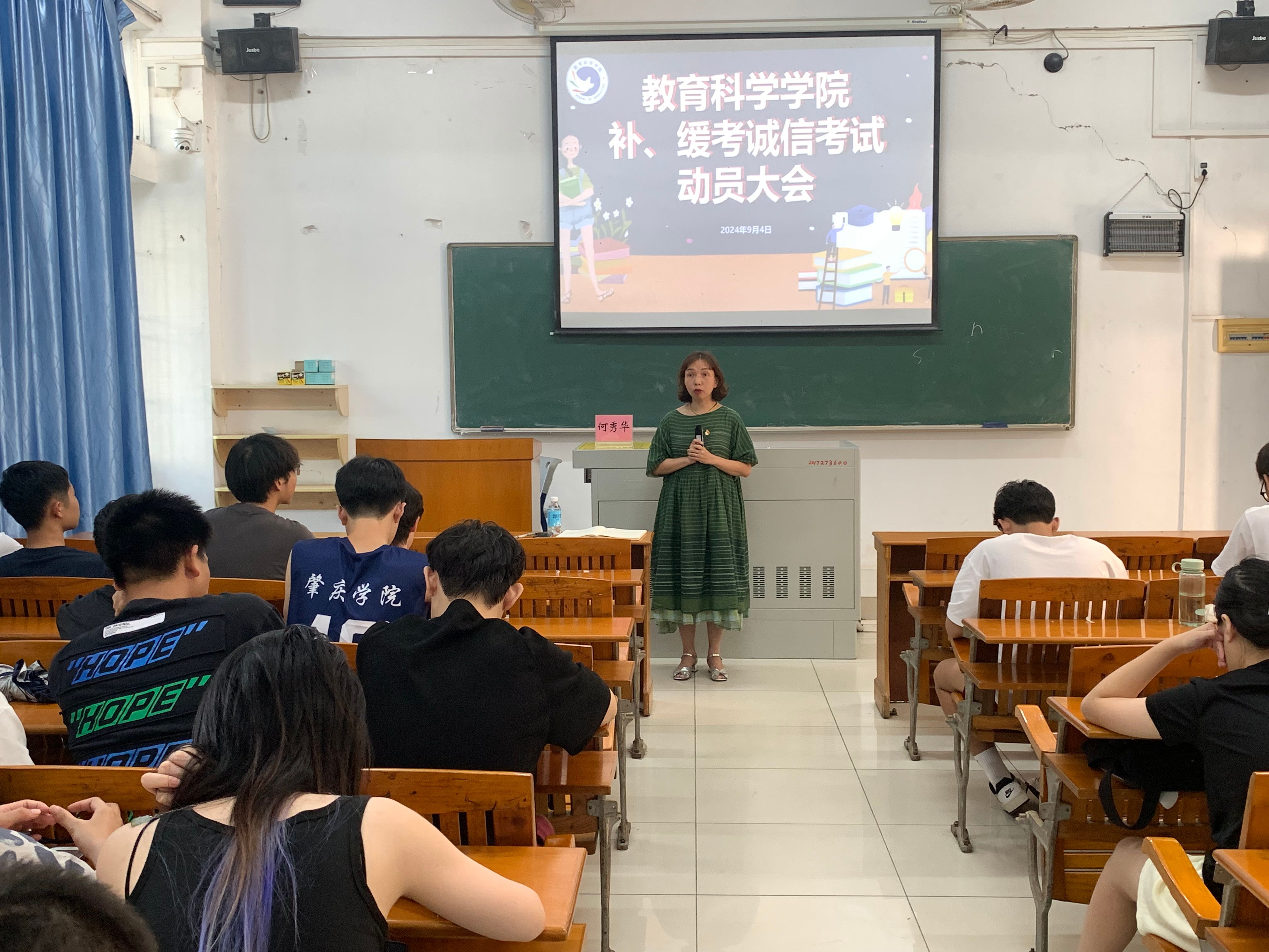 为加强学风建设,严肃考风考纪,2024年9月4日下午16点15分,我院于第三教学楼101室召开补考、缓考学生诚信考试动员大会。学院党委副书记何秀华、辅导员夏长洪出席,本次需要补考、缓考的学生参会。