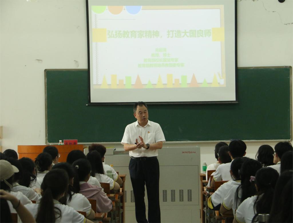 肖起清从“钱学森的教育之问”为切入,引导师生审视当前中国教育的现状及存在问题,从而聚焦到解答“钱学森之问”的关键,即“教育家精神”的培养上。他结合中外教育家的教育理念,阐述了习近平总书记所提倡的“教育家精神”的精神要义与丰富内涵,并在此基础上,结合师范生的特点,提出了大国良师职业锤炼的实践路径,鼓励师范生着眼大湾区教育发展以及乡村振兴背景下的乡村教育,发展个人兴趣,培养守正创新、超越自我、不畏艰难的精神品质,勇于挑战自我,注重提升教师形象礼仪。此外,肖副校长还特别强调师范生要树立正确的教师观念、职业观念和学生观念,践行教育初心,坚守教育使命,不断提升自身专业素养和教育能力。