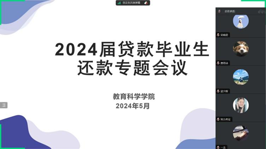 为帮助贷款毕业生了解生源地贷款的相关政策,指导他们做好还款计划以及熟悉还款流程。5月22日晚上8点,yl23455永利集团举办了2024届贷款毕业生还款指导专题线上会议。学院辅导员陈慧妍、梁少辉、朋辈辅导员龚碧莹以及2024届全体贷款毕业生参加了此次会议。