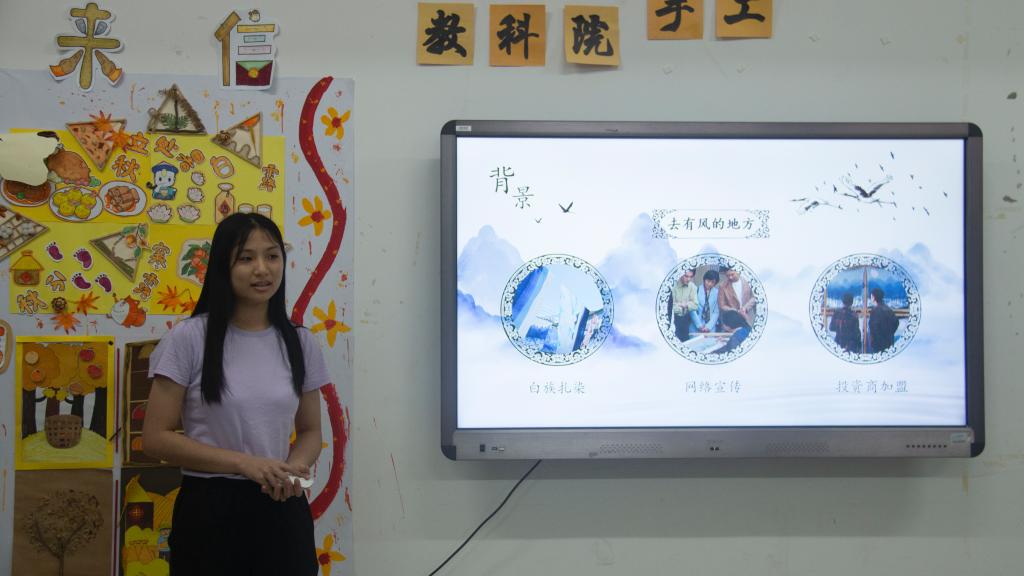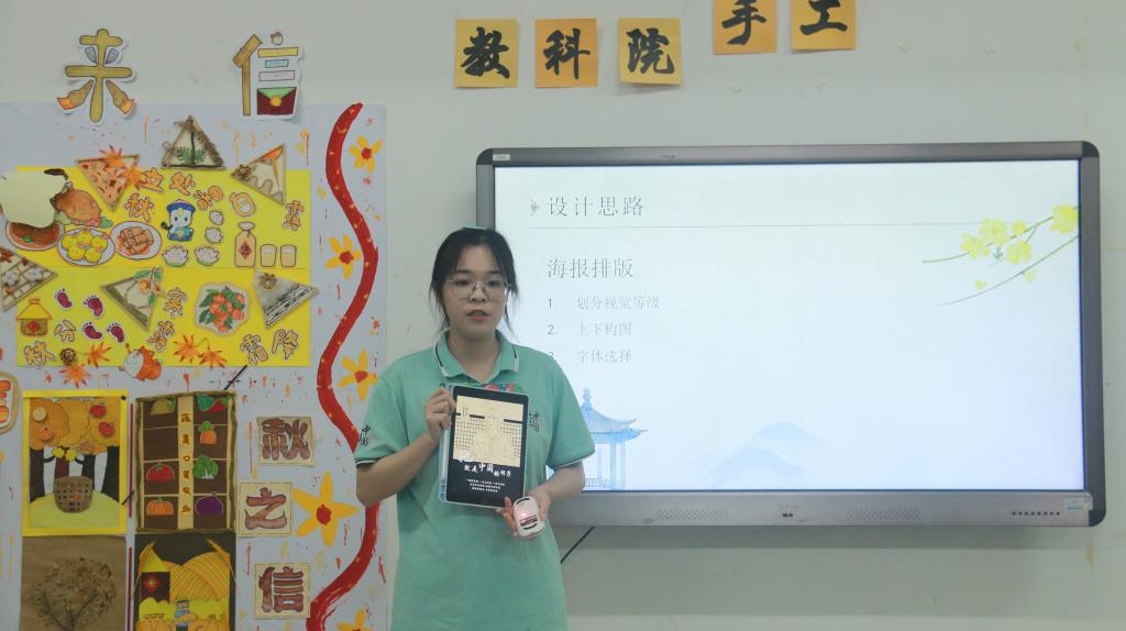 此次活动共收集44份参赛作品,其中有10组优秀作品进入决赛。作品形式多样,有视频、H5、PPT、电子海报、漫画和作品集等。比赛过程中,参赛选手们从作品构思、作品主题、创作过程、技术细节等多方面向大家展示作品的内涵,从多角度展现了选手们所理解的“多彩中国”。在陈述中无不体现了对生活的热爱、对中国式现代化的自信以及对青年梦想的追求。其中21教技1班伍婉童的电子海报《她,就是中国的样子》兼具思想性和技术性,获得一等奖。