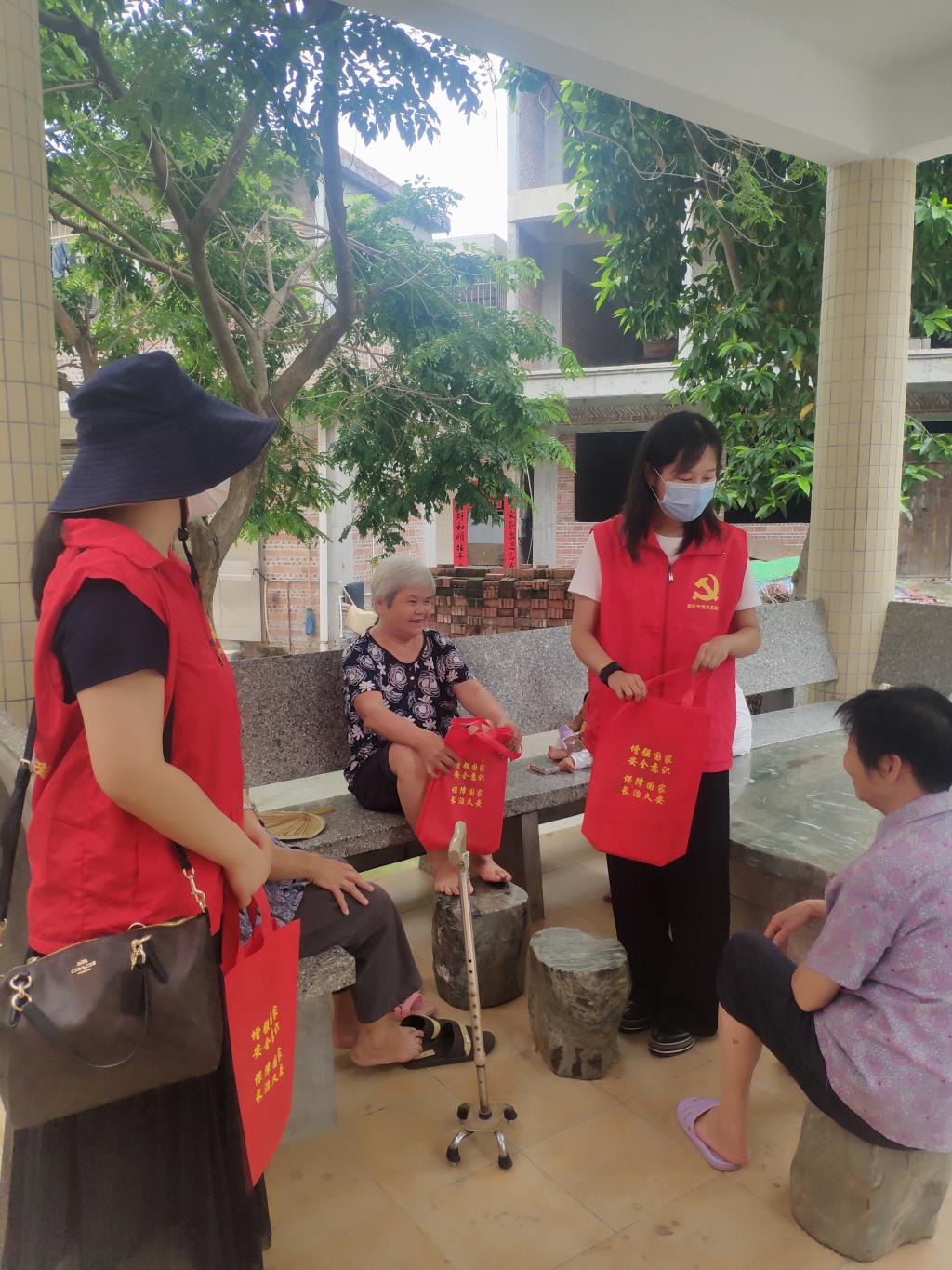 在学校就业处罗江鹏科长以及蕉园村社区领导的带领下,我院四位教师走入蕉园村社区,拜访了蕉园村的村民们,并向他们发放国家安全宣传手册,普及国家安全知识。通过大家的宣传与讲解,蕉园村的基层民众普遍增强了维护国家安全、履行保密义务的使命感,树立了一定的安全防范意识,并且掌握了基本的安全防范方法和有效途径。