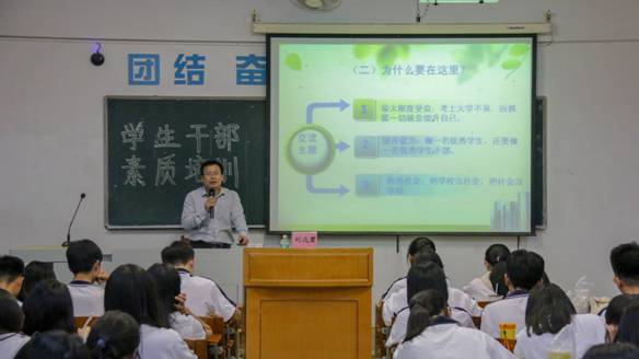 在培训活动中,刘书记定义了大学的“平台”作用,向学生提出“在大学平台扮演何种角色”之问,并就“学生干部如何培养素质能力”的问题进行阐述,号召学生干部需对大学生活及自身形成新认识,在大学中积极改变完善自身。刘书记对学生干部进行了准确的角色定义、强调学生干部的重要作用,并就“如何成为优秀的学生干部”提出了有效的建议。最后,他向学生干部寄予“学会学习、学会做事、学会做人”的殷切希望。在热烈的掌声中,本次培训大会完美地落下帷幕。