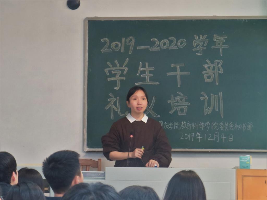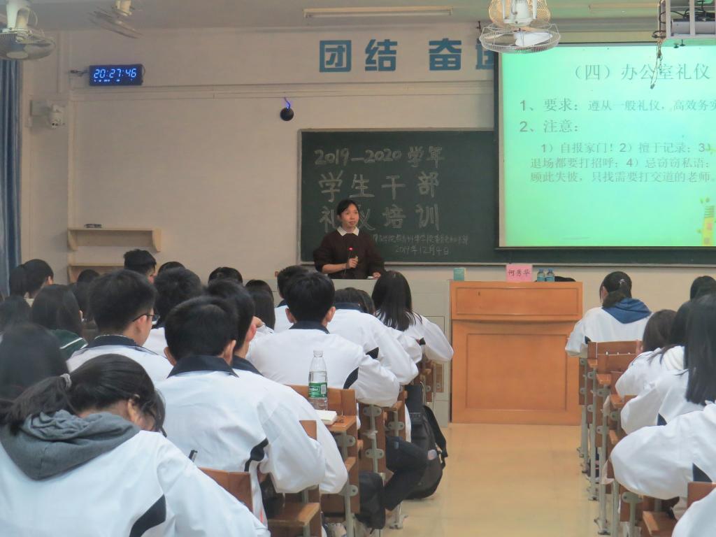 本网讯(通讯员/黎敏思 詹妮 拍摄/吴漫旋 责编/刘瑞雪)为提高yl23455永利集团学生干部的礼仪素养,我院于2019年12月4日19:30在第二教学楼605室举办“2019-2020学年学生干部礼仪培训”专题讲座。学院专职组织员何秀华为本次培训讲座的主讲人。辅导员兼团委书记刘瑞雪、2019级各班团支书及六大学生机构的2019级学生干部共123人出席本次讲座。