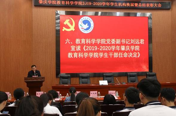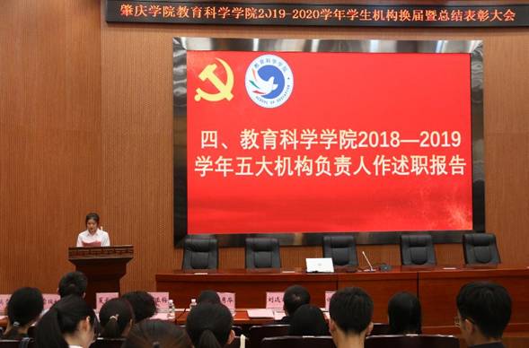 大会在慷慨激昂的团歌中拉开序幕。校学生会主席杨柳蕙对过去一年教科院学生活动的专业特色及取得的成绩表示肯定,希望新任干部承前启后,激发机构新活力,再创辉煌。接着,学院各机构负责人分别作述职报告。一年的时光如白驹过隙,时光送走上一年的学生干部,迎来新一年的新鲜血液,在学院领导和老师们为上一学年学生机构干部颁发聘书后,刘书记宣读新一届学生干部任命决定