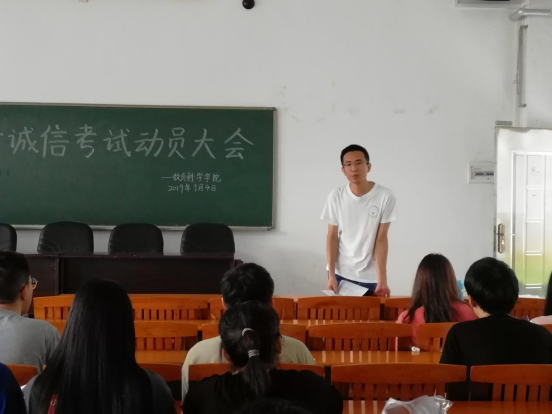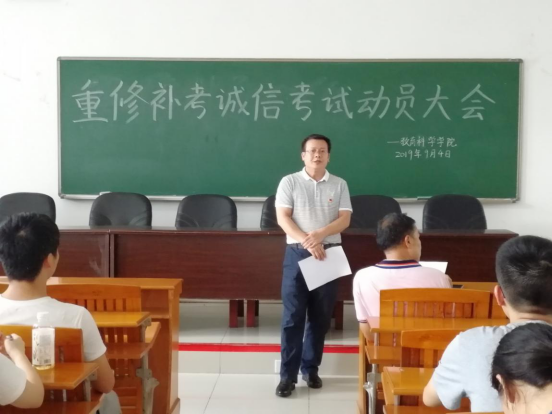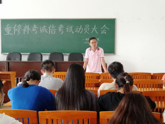 本网讯(通讯员 陈星宇)为加强学风建设,严肃考风考纪,9月4日下午15点,我院于第三教学楼107室召开补考学生诚信考试动员大会。本次会议由我院党委书记谢佐永以及党委副书记刘远君主讲,出席本次会议的有辅导员老师夏长洪以及我院全体需要补考的学生。