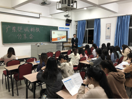 本网讯(通讯员 曾佳玲)12月26日晚7点, 广东德诚科教有限公司在第三教学楼312室,开展了面向教育技术学专业学生的分享交流会,20多名学生参加了本次会议。