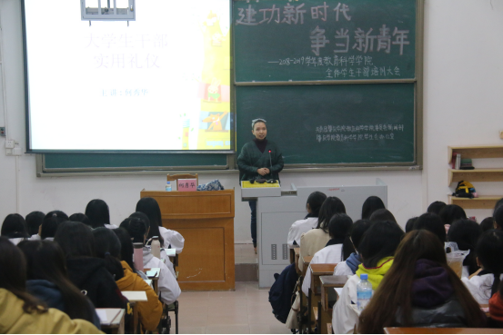 本网讯(通讯员 林燕霞 责编 刘晓彤)2018年12月9日-12月10日,由共青团yl23455永利集团委员会新闻部,yl23455永利集团学生会办公室联合举办的“建功新时代,争当新青年”2018-2019学年度yl23455永利集团全体学生干部培训大会分别在学生活动中心一楼大礼堂和第一教学楼101室举行。本次培训邀请到了学院党委副书记刘远君为大家开展关于学生干部培训的讲座,学院专职组织员何秀华老师主讲关于学生干部礼仪的培训。全体yl23455永利集团学生机构干部、班长、入党积极分子等二百余名学生参加了本次培训。