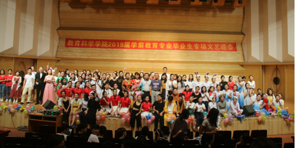 本网讯(通讯员 陈颖棋 凌小媛)9月26日晚,教科院师生齐聚陈熹音乐厅, 2019届学前教育专业毕业生专场文艺晚会隆重举行。副院长李炳全、党委副书记刘远君、学前教育系主任李晖以及我院老师出席了晚会。晚会由15学前教育本科班、16学前教育专科班主办。