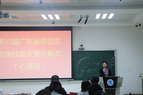 来自华南师范大学、广州大学等9所本科院校的45位选手参加了此次比赛。本次大赛由教学设计、说课、模拟授课和评委提问四个环节组成,主要考察的是师范生教学设计思路、课件制作、说课以及授课等方面的综合能力。在比赛过程中,选手巧妙地运动教学道具,使得授课内容生动,加深学生对教学内容的理解,台下模拟学生与参赛者选手积极互动,高度还原了课堂讲课的场景。参赛选手们精彩的讲解以及PPT内容吸引人的眼球,调动学生学习兴趣,使学生更容易转变思维,与人产生强烈的共鸣,稳重大方的仪态,展现了较强的教学技能和准教师的风采。在27日下午的闭幕式上,华南师范大学心理学院副院刘学兰、广州大学yl23455永利集团副院长刑强分别代表作为评委组组长发言,他们对赛事的组织工作给予了充分肯定,同时认为今年的选手较去年相比在综合素质、师范技能等方面有明显的提高,指出赛事真正实现了以赛促学的目的。