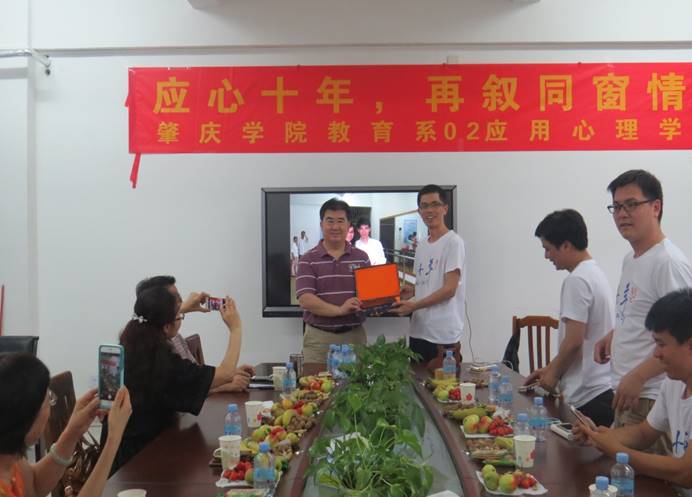 最后,为了感谢学院的培养之恩,02应用心理学班校友代表金洁煌向学院赠送了纪念品。