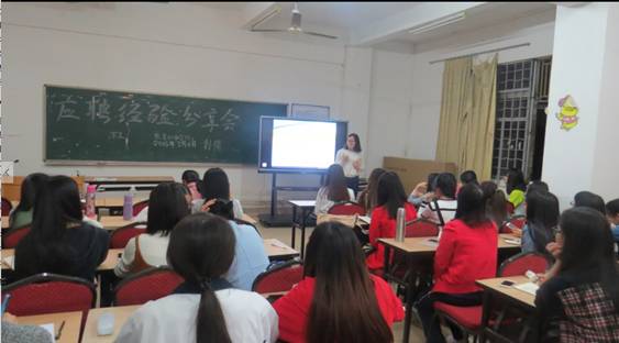2016年 3月4日晚上8点,我院邀请了15届优秀校友杜惠端、潘媚在鲁迅楼演示室开展了教师应聘经验分享会。辅导员赵书栋以及各年级的小教、初教班近百名同学出席了本次分享会。