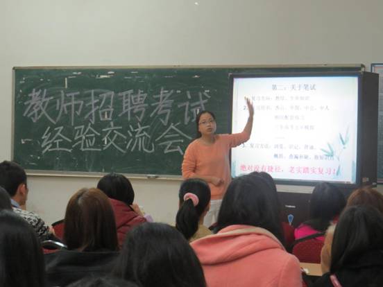 本次教师招聘交流会为正在或将要参加教师招聘考试的同学指明了方向,明确了目标,增强了信心、激发了斗志。同学们也纷纷表示:希望以后能多举办此类交流会,将对同学们产生很大帮助。最后,引用曾丹曼赠与大家的一句话:机会是留给有准备而且不断坚持的人!希望我院学生能吸取前人宝贵经验,在今后的教师招聘考试中再创佳绩、实现当教师的梦想!