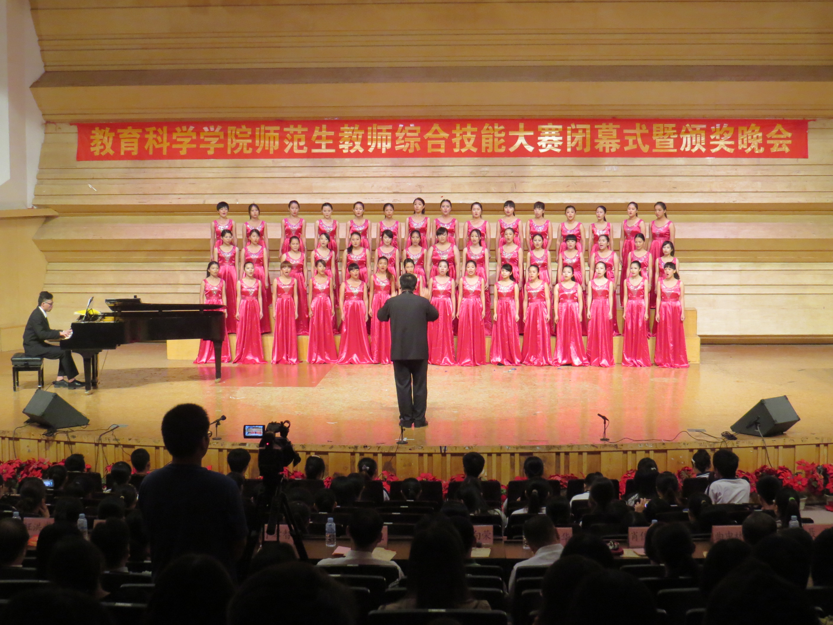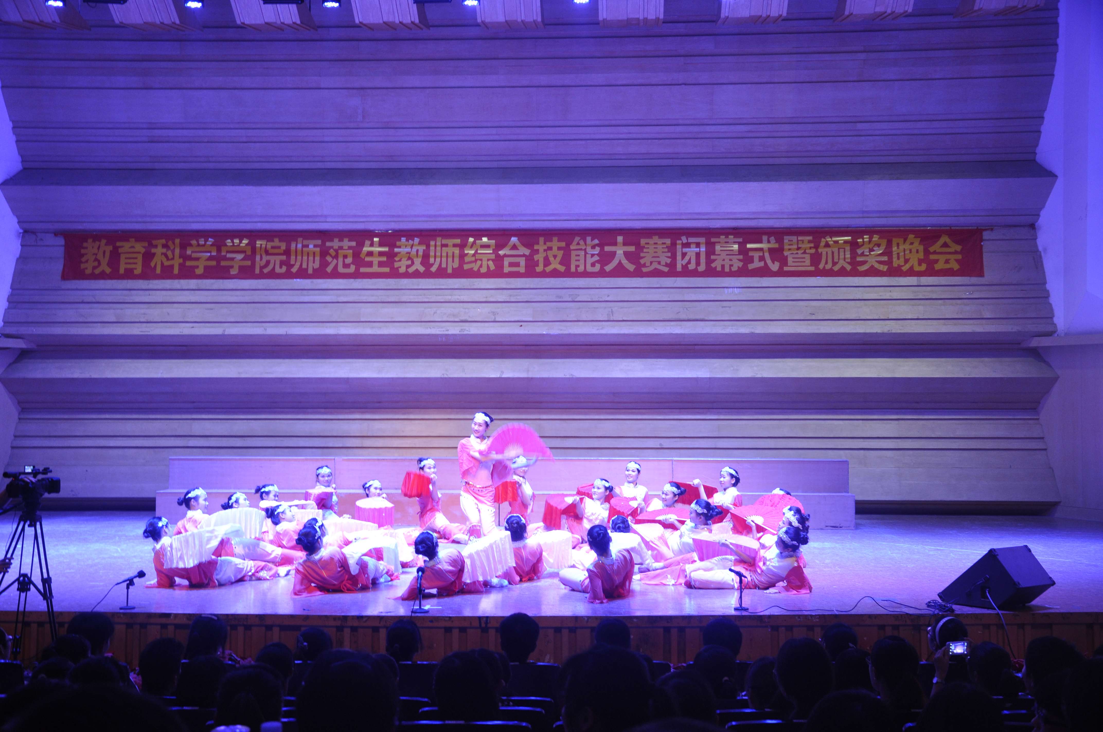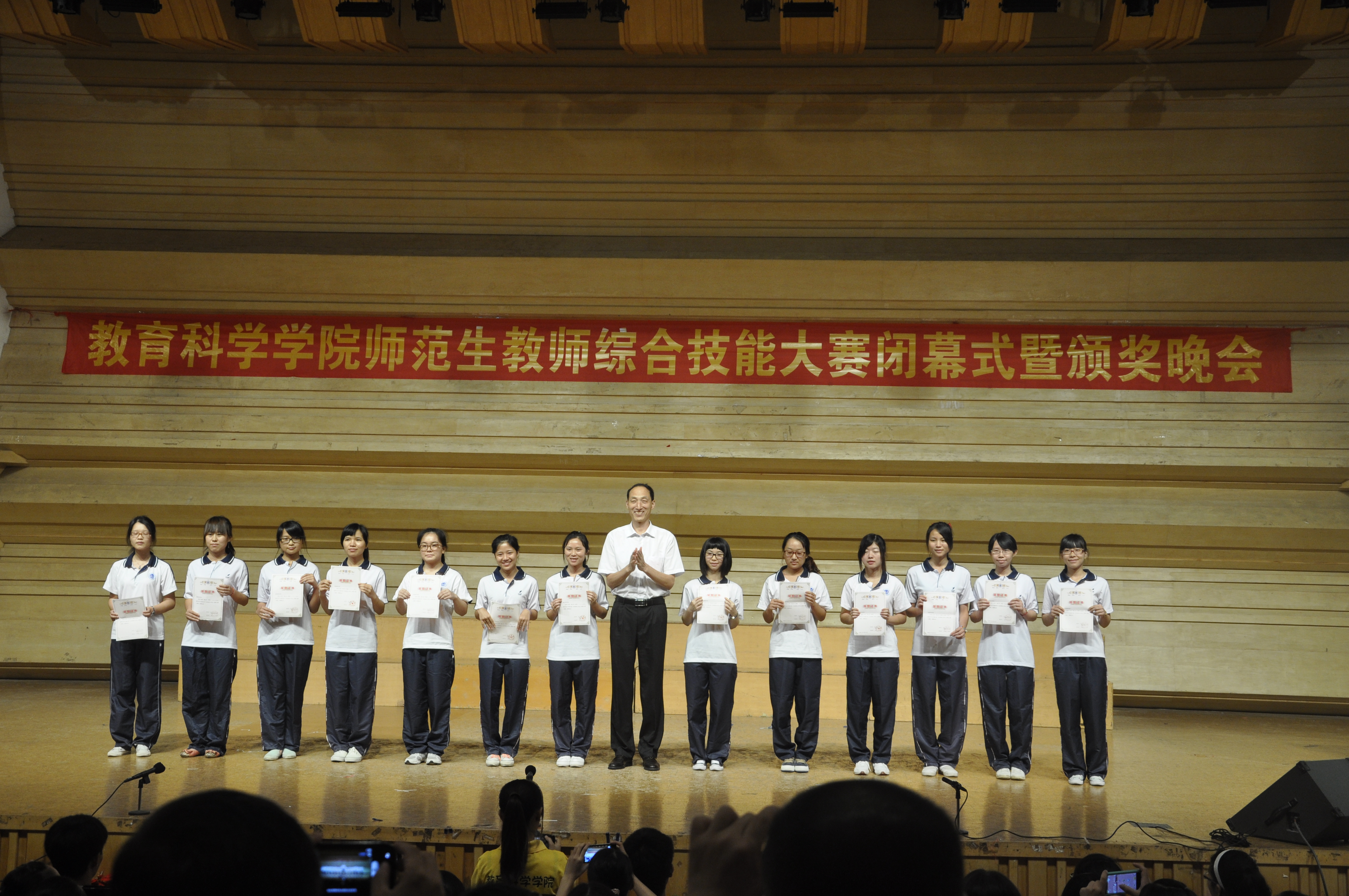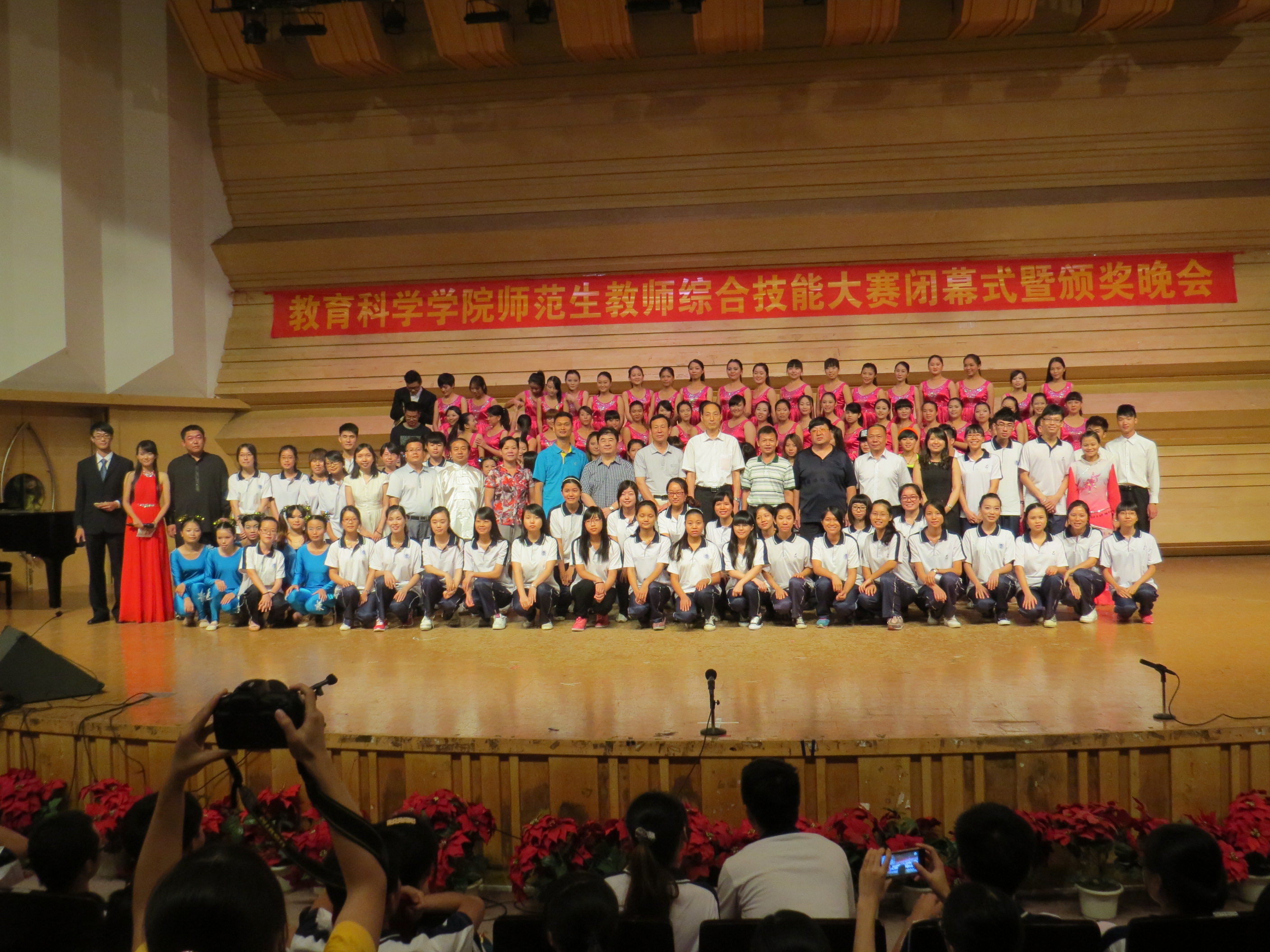 2014年6月8日晚,yl23455永利集团2013—2014学年度师范生教师综合技能大赛闭幕式暨颁奖晚会在陈熹音乐厅隆重举行。出席本次晚会的领导和嘉宾有:校长和飞、教务处处长丁孝智、学生处处长陈向荣、就业处处长梁建梅、教育发展基金会主任、招生办副主任张滔华、校团委书记肖俊霞、学生处副处长周建文、厚德书院院长曲中林、力行书院院长王敏,以及教科院全体教职员工和部分学生代表。