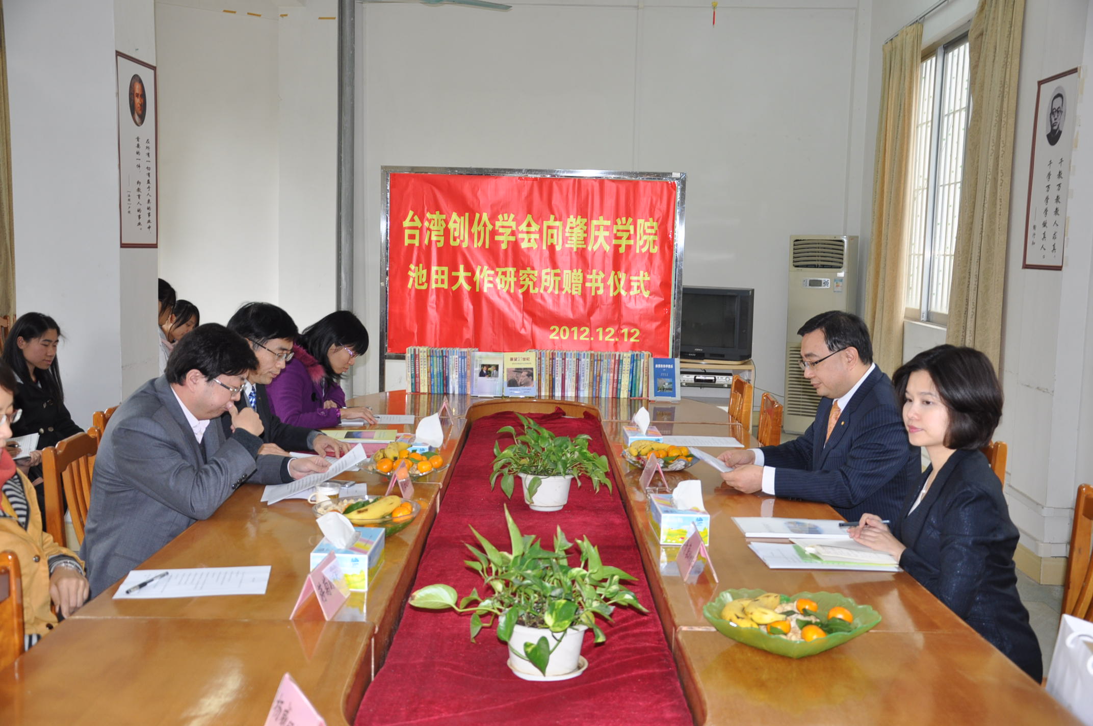 2012年12月12日,台湾创价学会文教处处长洪玉柱一行到访我校,并代表台湾创价学会向我校池田大作研究所赠送一批最新出版的池田大作书籍。池田大作研究所名誉所长、教育学院院长胡海建,池田大作研究所所长、教育学院副院长原青林代表我校接受了捐赠。 赠书仪式在教育学院会议室进行,胡海建院长和洪玉柱处长代表双方作了致辞,原青林所长主持了此次赠书仪式。