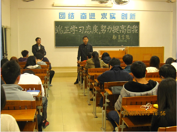 教育学院为促进学风建设,端正后进生的学习态度、把学业成绩提高上去,我院于3月6日晚在九栋616开展了以“端正学习态度,努力提高自我”为主题的考风考纪教育大会。参加本次会议的学生是本学年度上学期没有通过考试的同学。我院党委副书记刘远君老师及辅导员赵书栋老师也出席了本次会议。