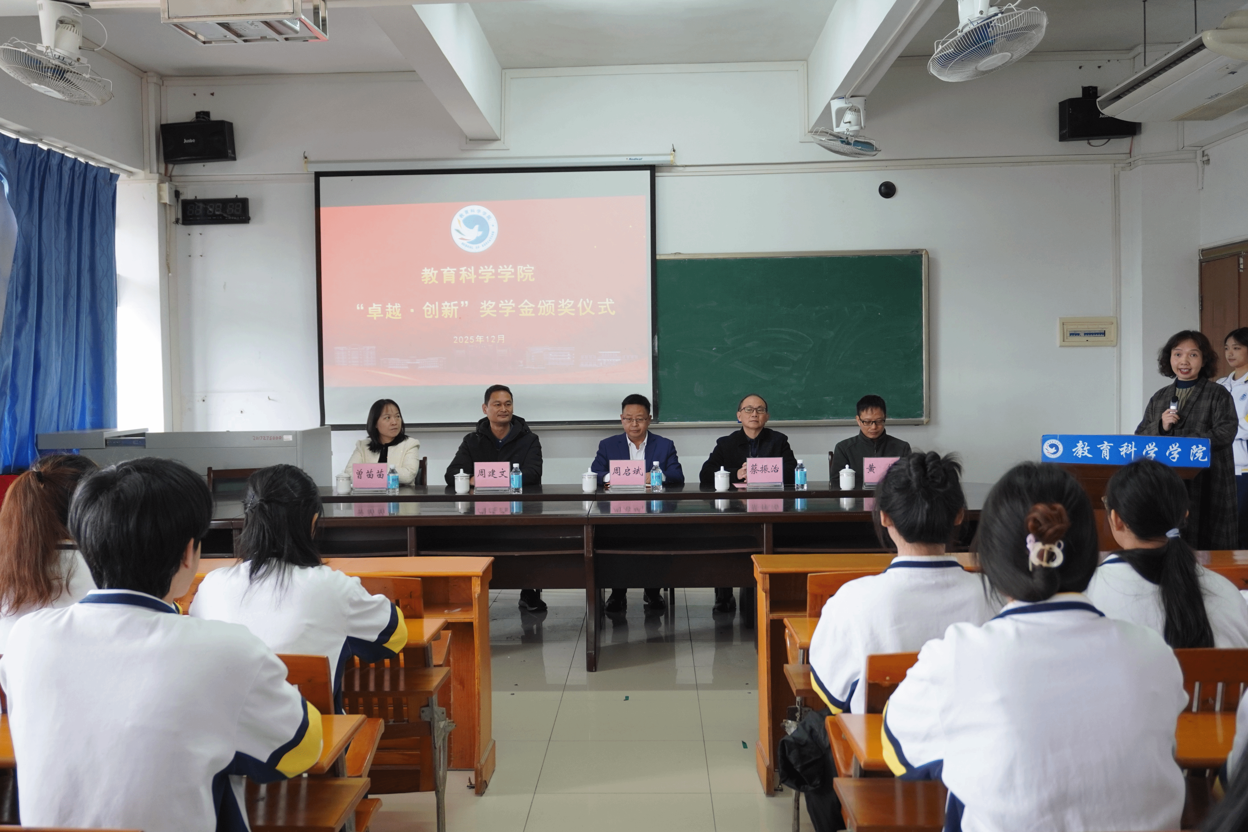 该项奖学金的设立,是学校建校 55 周年之际,社会力量助学兴教的生动体现。周启斌先生心系学院发展,特别从校庆捐款中划拨2万元,专项奖励在学业成绩、专业竞赛及创新创业方面表现突出的本科生。经严格遴选,本次会议共表彰23名学子、24个项目,涵盖获得省级以上师范生技能赛、双创赛获奖者及各年级专业绩点第一的优秀学子。