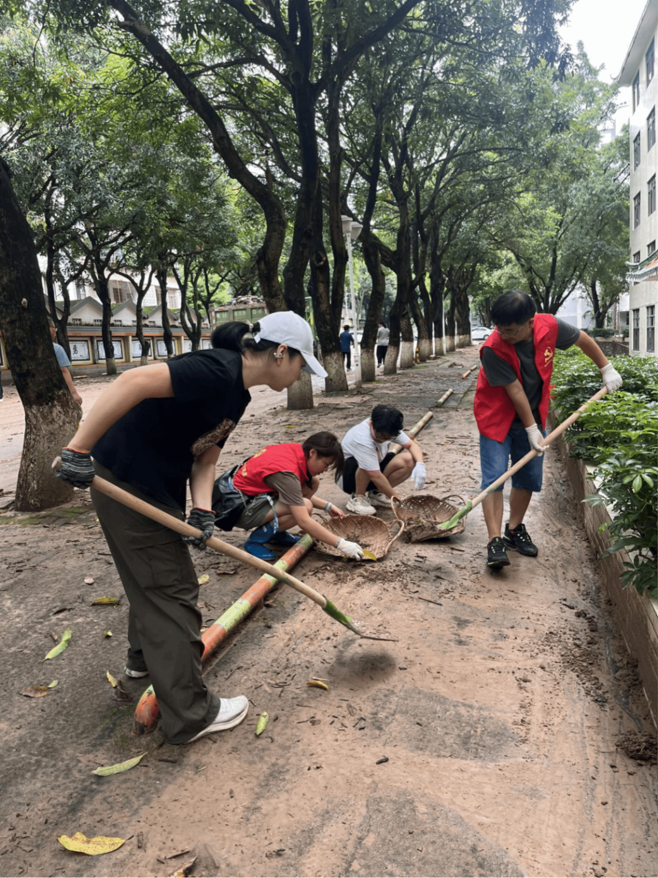 在本次行动中,我院党委书记蔡振治带领教师党员廖悦诗、赵书栋、林琦、黄伟伟、黄良荣以及学生志愿者陈宝瑜积极参与到清淤复产行动中,与马克思主义学院等10个二级学院志愿者队伍一起负责溢思路(第一教学楼北侧至生物园门口)片区。