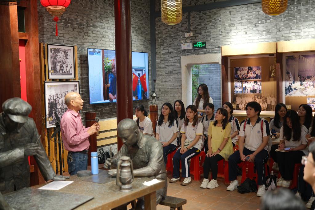 第一站,师生们来到了中共南三花工委旧址。在南三花工委史迹展览馆,七十多岁的老党员沈夑洲激情讲述了沈村革命老区的形成和中共南三花工委在解放战争前的伟大功绩,后又满怀感恩举例了中国共产党领导下沈村及其周边村落的巨变。结语时,沈夑洲同志用一个老党员的身份殷殷嘱托大家:“解放战争前,我们用身体保卫国家;今天,我们要尽己所能为社会主义事业添砖加瓦”。