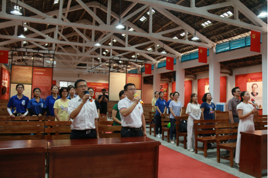 中午,在妥善安顿好三下乡队员之后,党员一行乘车前往南街镇,抵达江美村党群服务中心。在讲解员的带领下,党员同志们参观革命历史长廊,重温共产党建党历史,缅怀艰苦卓越的革命先辈事迹。在初心堂,从广宁县革命历程的影片中,党员同志们学习江美村“敢为人先,敢为斗争,敢为奉献”的革命精神;在歌曲《没有共产党就没有新中国》的合唱中,党员们以慷慨激昂的歌声表达对党的热爱。最后,在谢佐永书记带领下,党员们一起重温入党誓词,坚定有力地表达了为党的事业奋斗终生的决心。