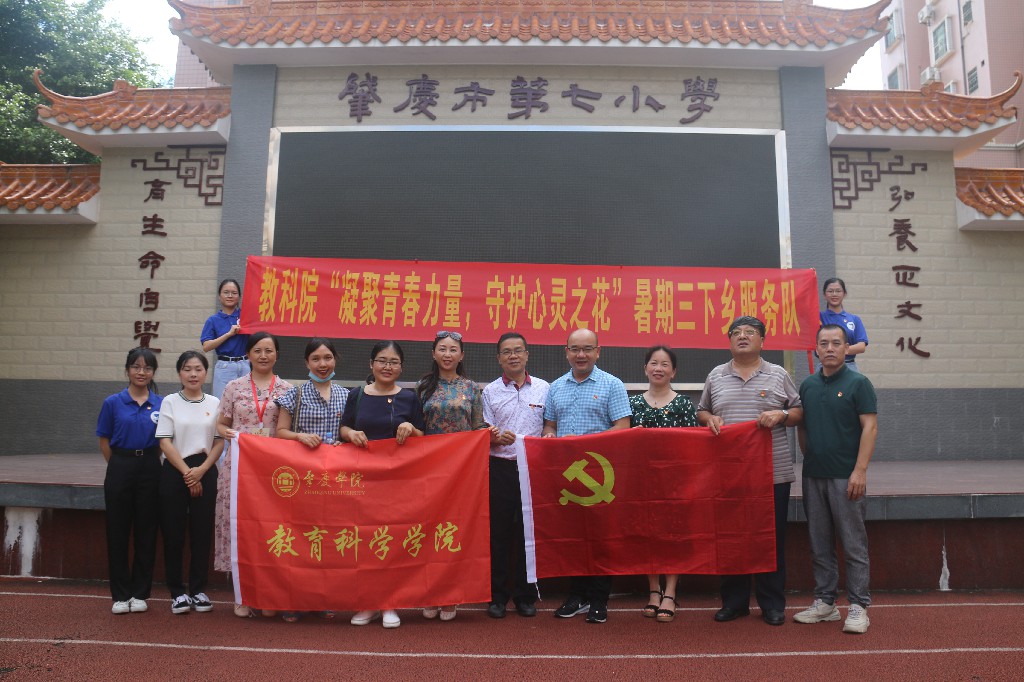 迎着大暑的烈日,伴着琅琅读书声,2020年7月22日,yl23455永利集团应用心理学系教师党支部会同学院团委大学生暑期“三下乡”社会实践活动队伍,赴肇庆市第七小学开展主题为“凝聚青春力量,守护心灵之花”的“三下乡”社会实践活动。学院党委书记谢佐永、应心支部书记丘碧群、包括院长张旭东在内的支部成员及学生志愿者参加了本次活动。