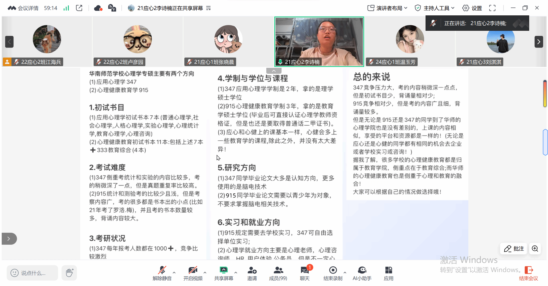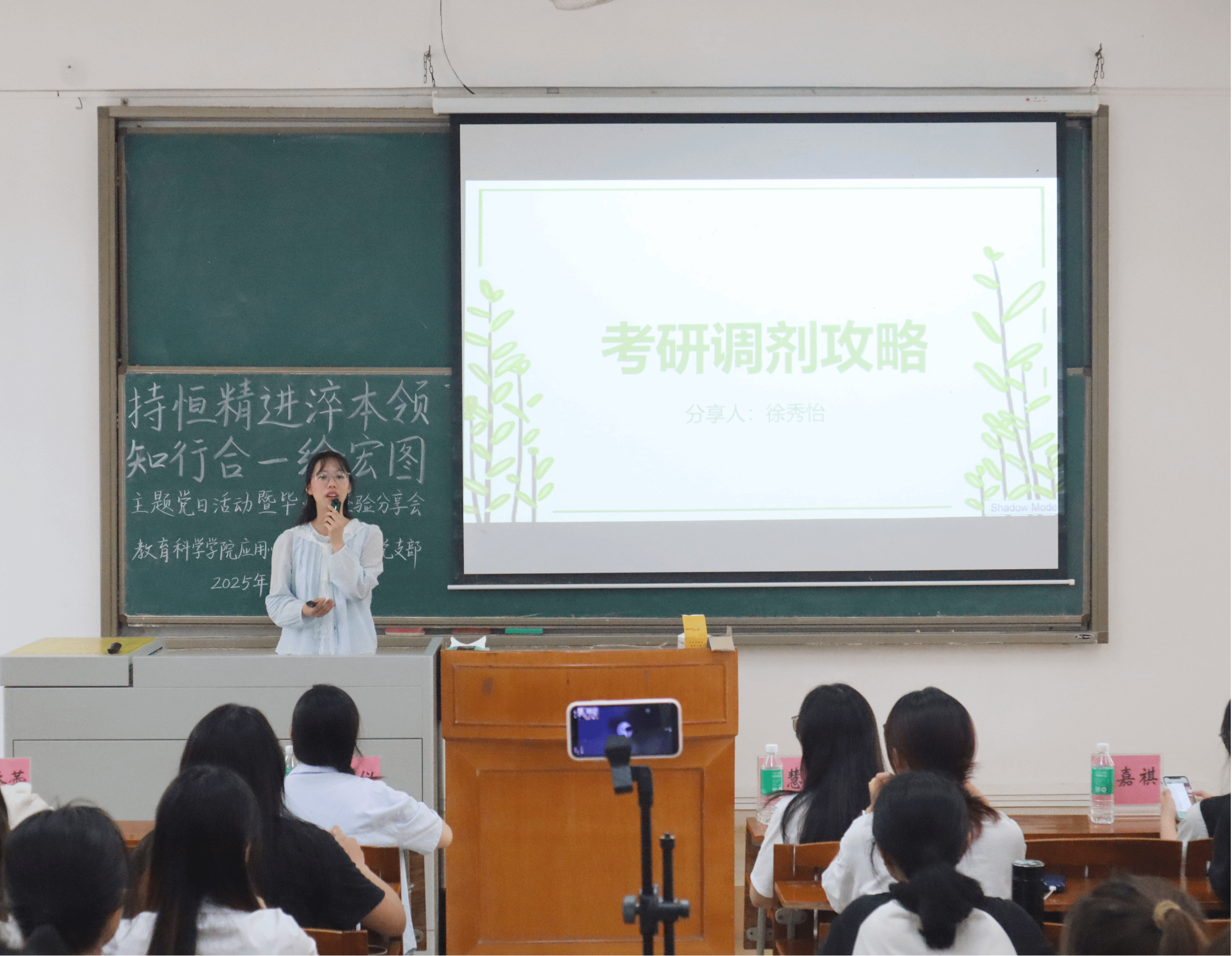 考研方面,张晓晨分享了境外硕士研究生申请经验,涵盖申请动机、备考雅思、选校规划等方面,为计划出国深造的同学提供参考。李诗楠从院校选择、专业匹配等角度,详细讲解心理健康教育专业备考要点,她指出院校和专业选择要考虑个人职业规划、科研实力以及招生人数等因素。余嘉祺则结合自身经历,梳理考研关键节点,分享学习计划,强调复试与心态调整的重要性,建议前期夯实专业基础、积累实践经验。徐秀怡聚焦考研调剂,解析调剂条件、流程及注意事项,提醒同学们选校时需结合自身需求综合考量。
