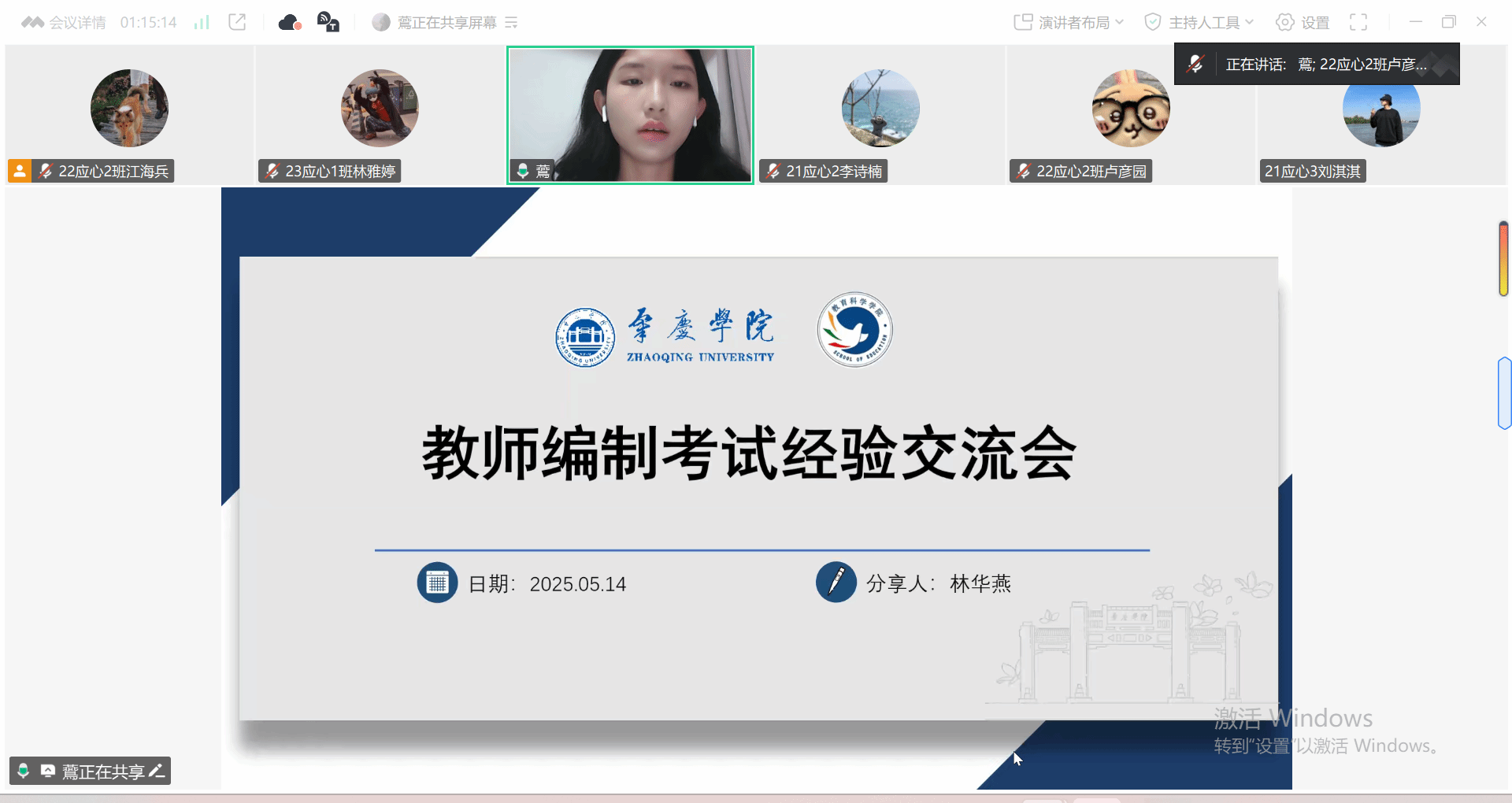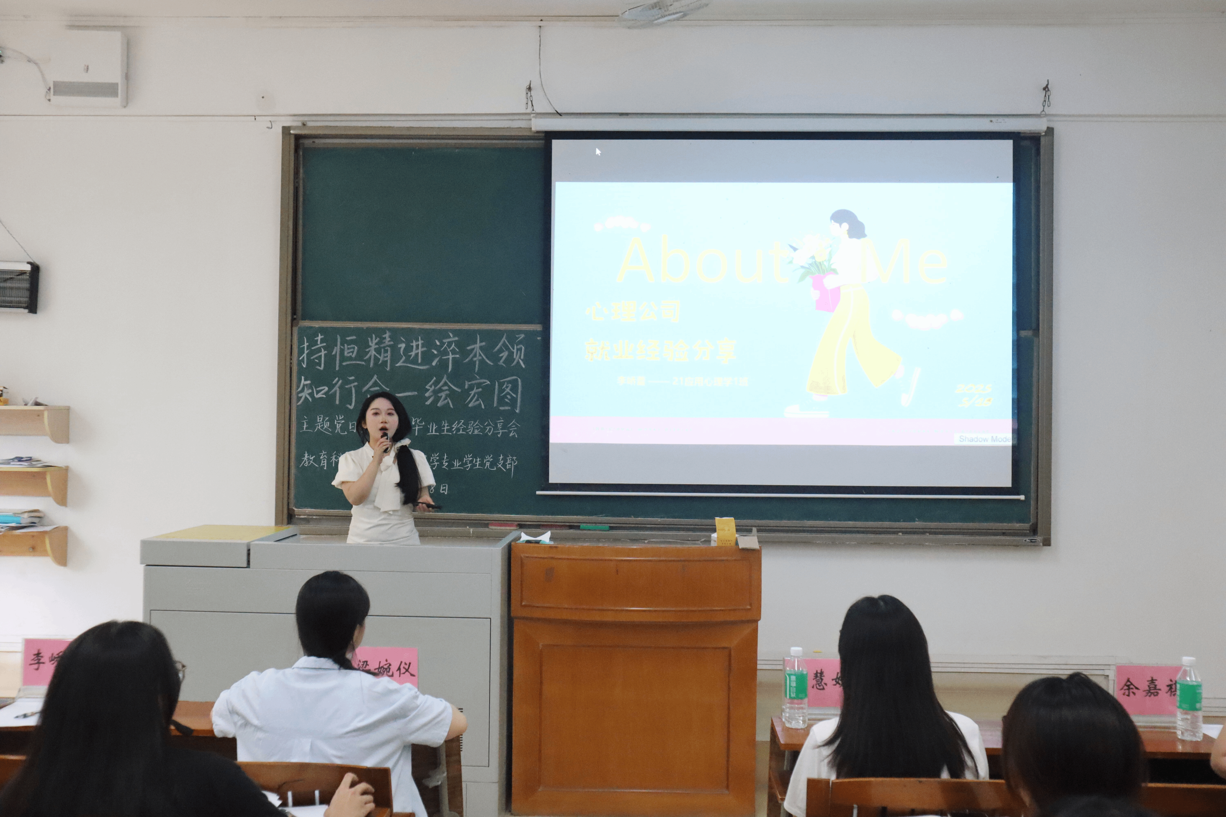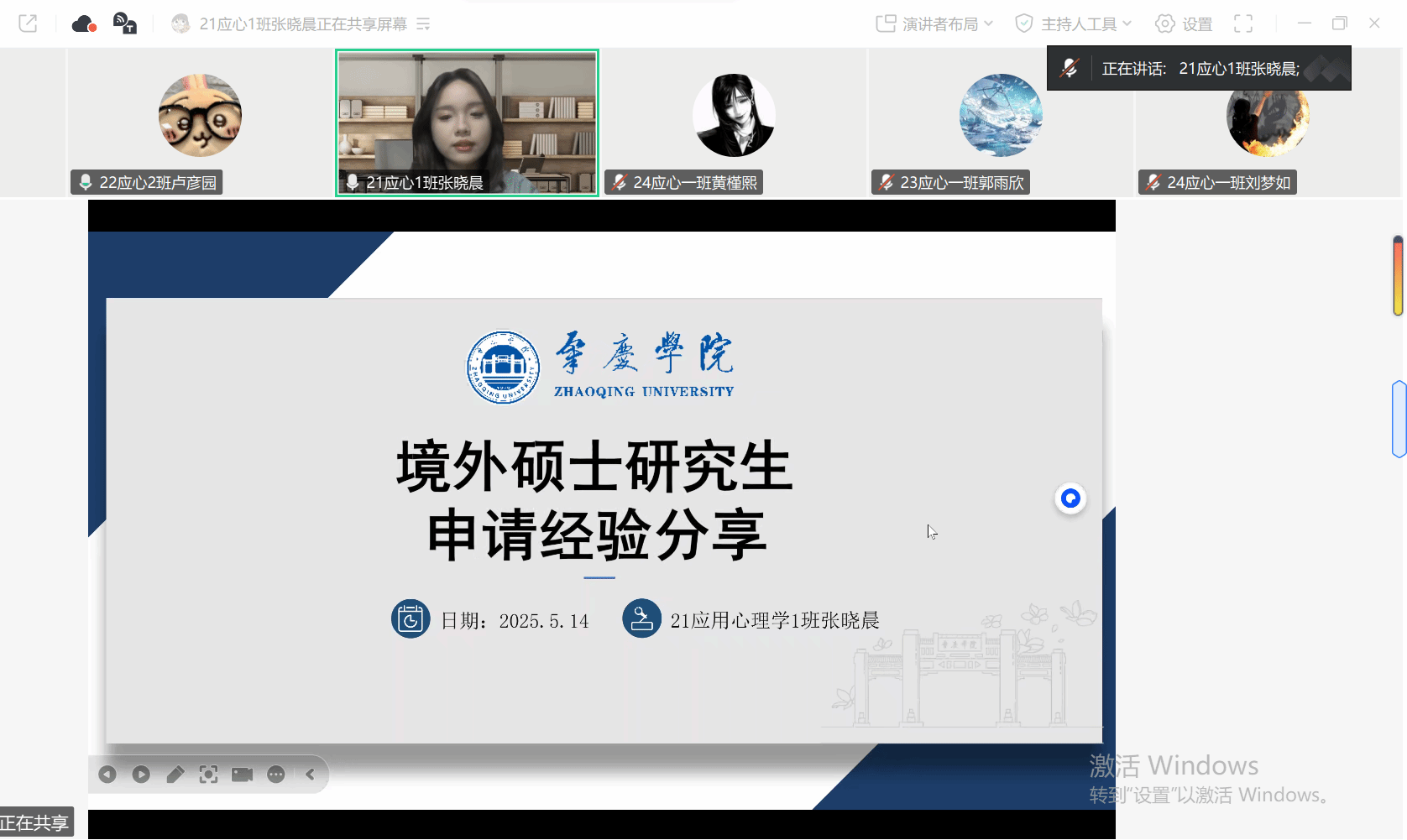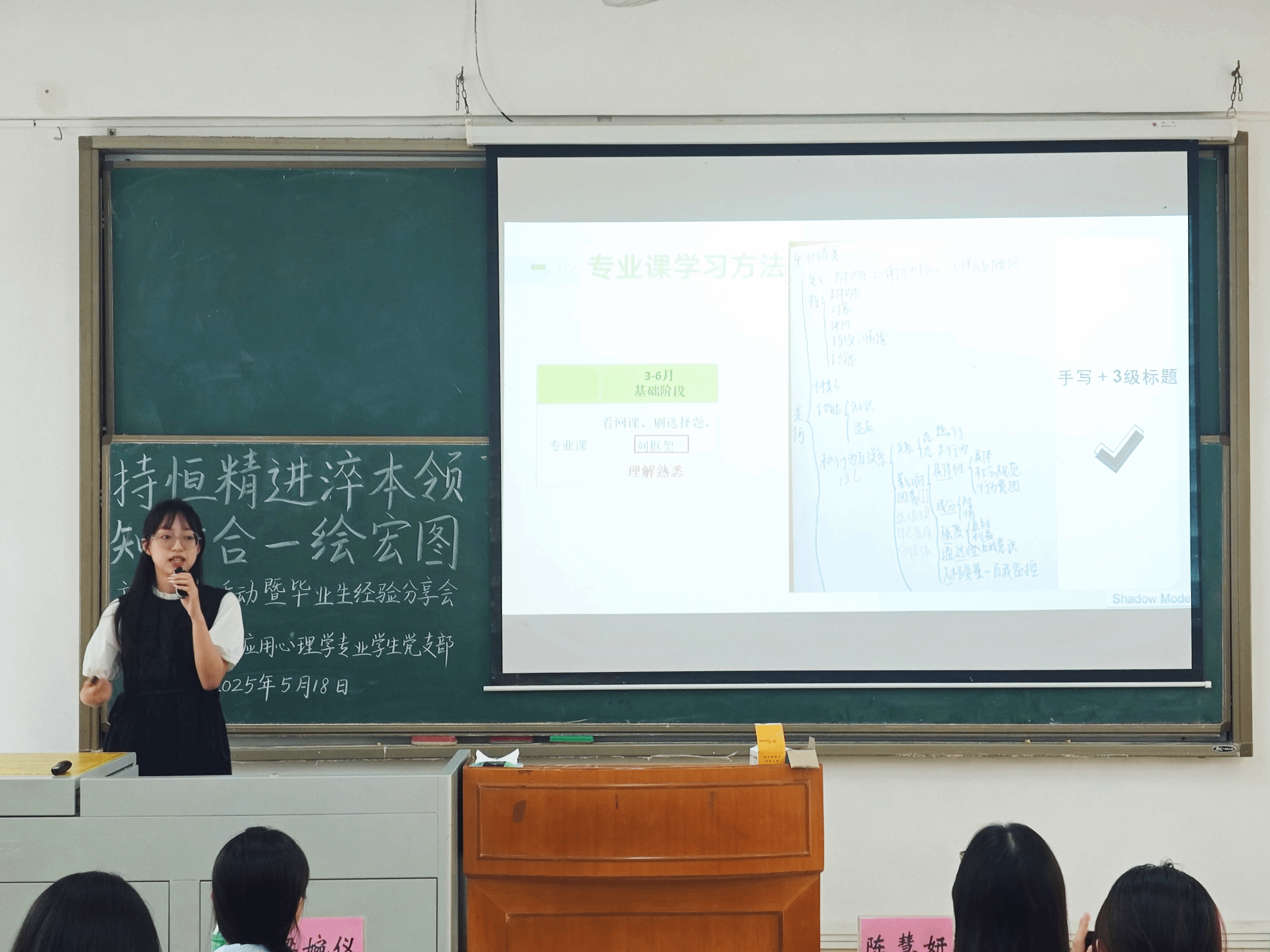 两场分享会分别以“明德惟馨铸信念,砥砺奋进谱新章”和“持恒精进淬本领,知行合一绘宏图”为主题。其中,2021级应用心理学张晓晨、刘烁帆等8名毕业生代表依次分享了升学及就业经验。应用心理学专业学生党支部书记陈慧妍老师出席本次会议,应用心理学专业各年级200余名学生参加。