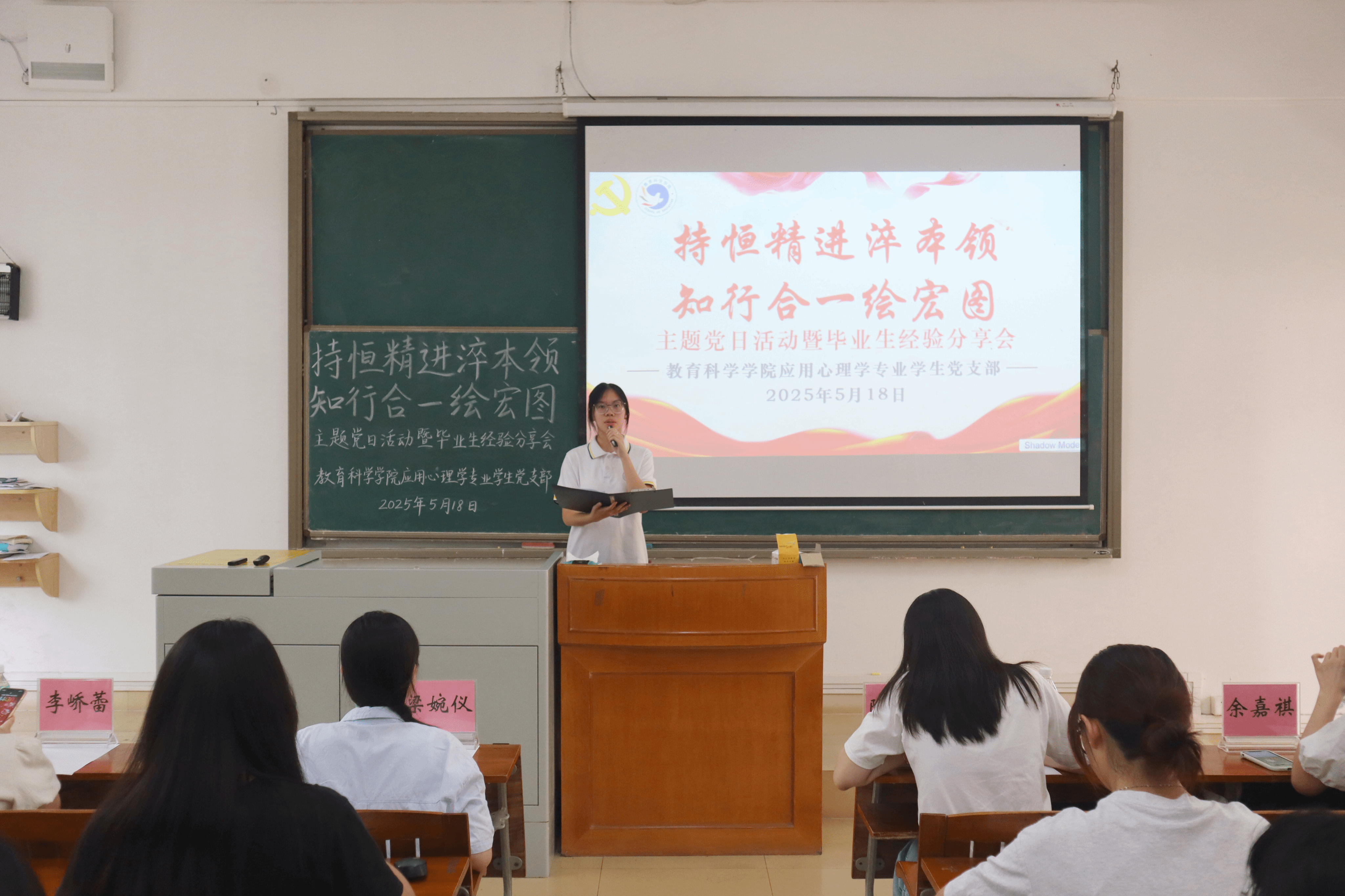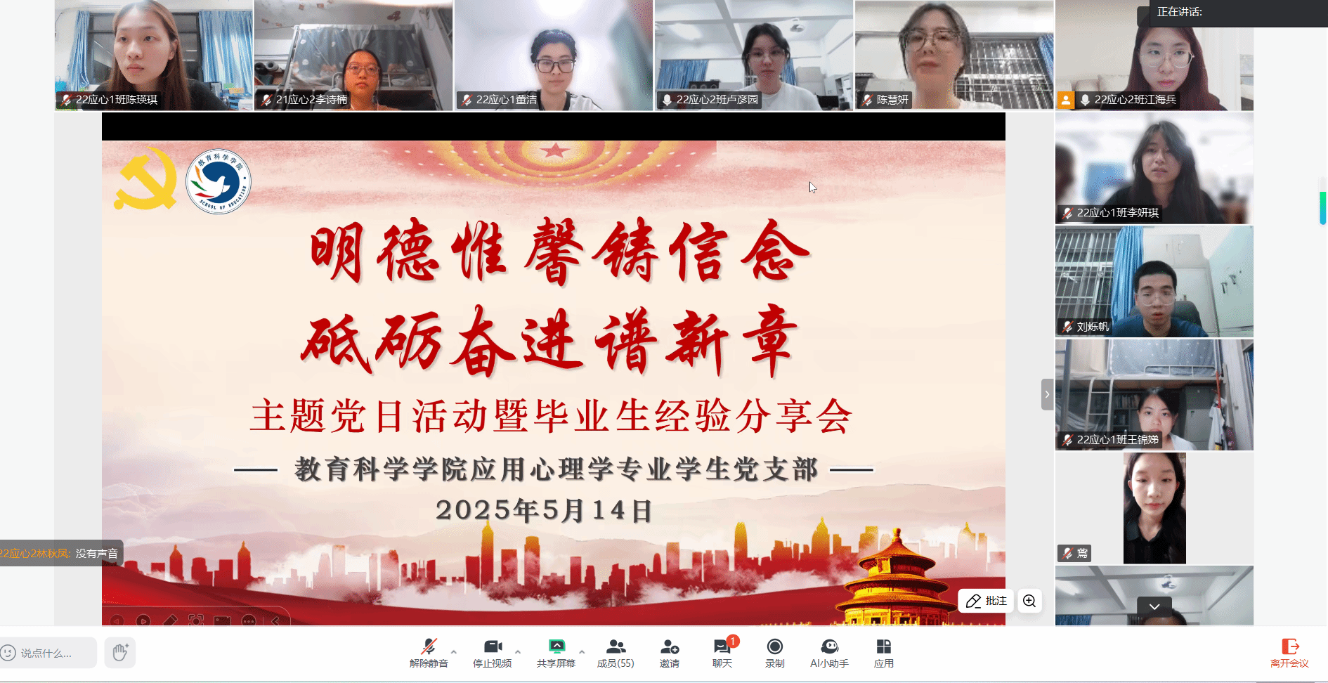 本网讯(通讯员/卢彦园 冼皓 责编/陈慧妍)为深入学习习近平总书记关于全面加强党的纪律建设的重要论述,充分发挥党员先锋模范作用,推动应心学子笃行致远,2025年5月14日及18日,应用心理学专业学生党支部组织了两场主题党日活动暨毕业生经验分享会,活动以线上线下结合的形式展开,旨在以党建引领助力学生成长,为应心学子们的未来发展指明方向。