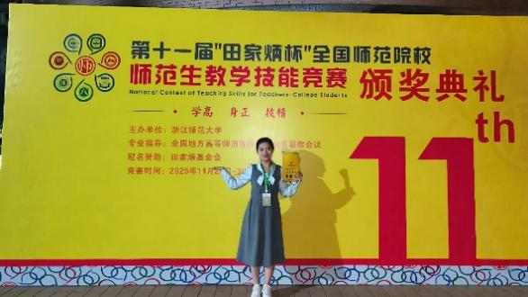 【本网讯】金秋传喜讯,杏坛绽芳华。在第十一届“田家炳杯”全国师范院校师范生教学技能竞赛中,我院2022级小学教育专业陈美琳同学表现出色,荣获全国二等奖,展现了我院学子扎实的专业素养与良好的精神风貌。