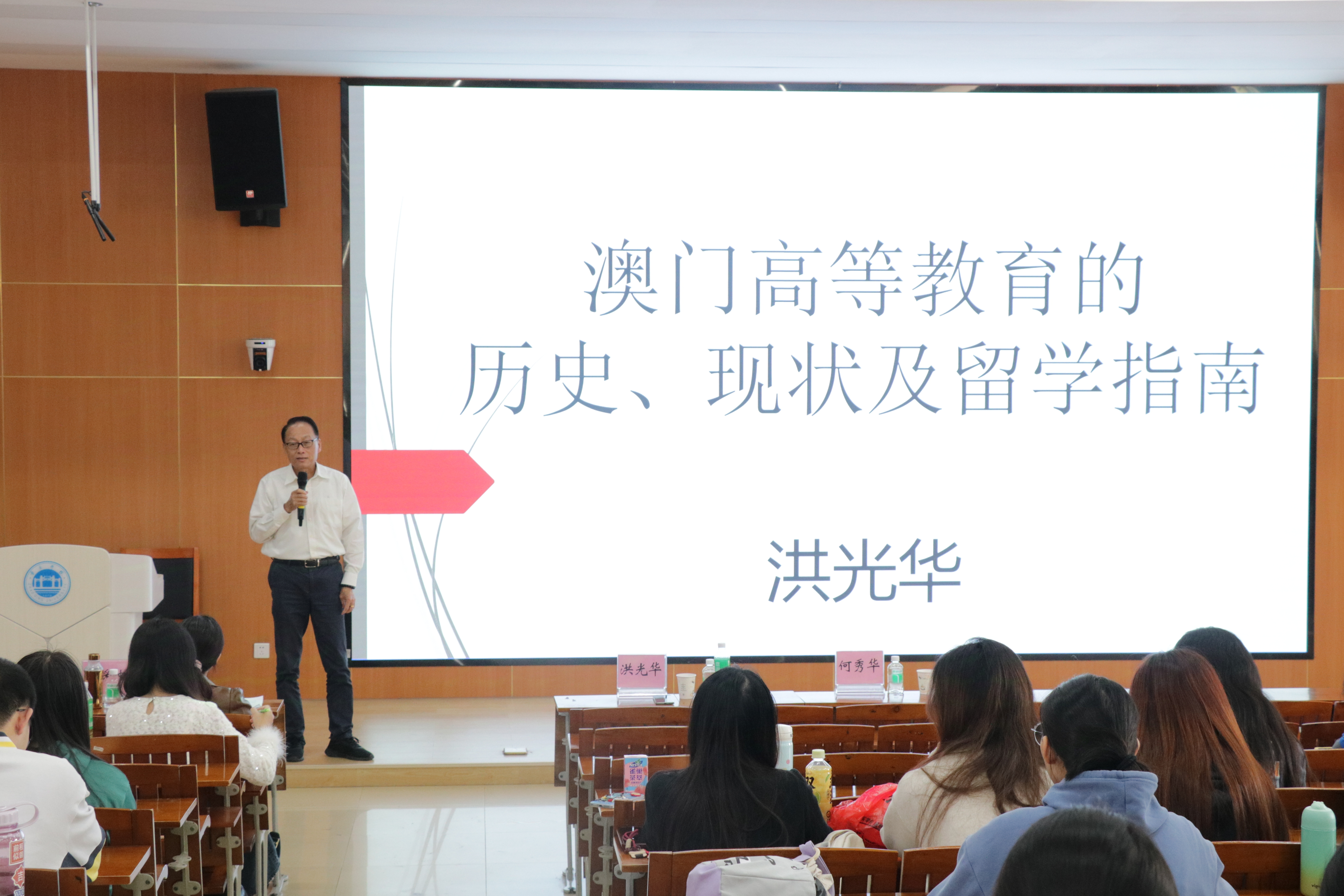 洪光华博士的讲座内容以介绍澳门高等教育为主旨。巧妙地从历史引入,他先是展示了澳门大三巴的图片,引发在场师生对于大三巴历史的好奇和思考,随后系统地从历史地角度为在场师生全方位介绍了澳门高等教育的起源、发展、现状,使得在场师生能够更深刻的了解到澳门高等教育的发展。此外,洪博士还分享了澳门、香港留学指南,并从实习、就业、入籍等多个角度为我们详细地讲解澳门、香港目前实施的政策以及要求。最后洪博士给在场师生分享了“黑中介假学历”的新闻,并由此给在场师生提出三点建议:一、就业优先。二、不轻信中介。三、诚实守信,量力而行。这使得在场师生对前往澳门留学的注意事项有了更深入的了解,并在一定程度上提高自身的防诈意识。