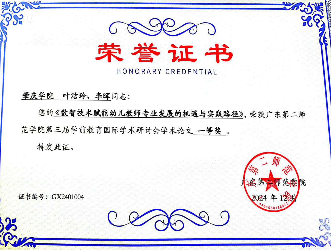 经专家评审,叶洁玲在其导师李晖教授的指导下撰写的论文《数智技术赋能幼儿教师专业发展的机遇与实践路径》荣获研讨会学术论文一等奖。这不仅是对她们努力的肯定,也体现了教科院研究生培养的高质量。此次获奖论文聚焦教育管理领域中的幼儿教师专业发展,探讨了数智技术在其中的作用,展示了教育管理方向研究生在学前教育研究中的积极探索与成果。
