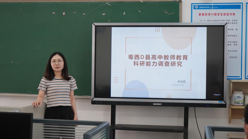 黄漪琪同学对个人基本情况、学习近况、最近研究及未来学习计划四个方面展开汇报。她结合自身在中职教学工作的特点,以产教融合背景下的中职学校青年教师的教育科研能力现状进行调查,具体包括研究背景、问题提出、文献综述、研究设计及结论。在汇报过程中,她分享了自己在做研究时出现不同的问题、反思问题产生的原因及解决的方法。