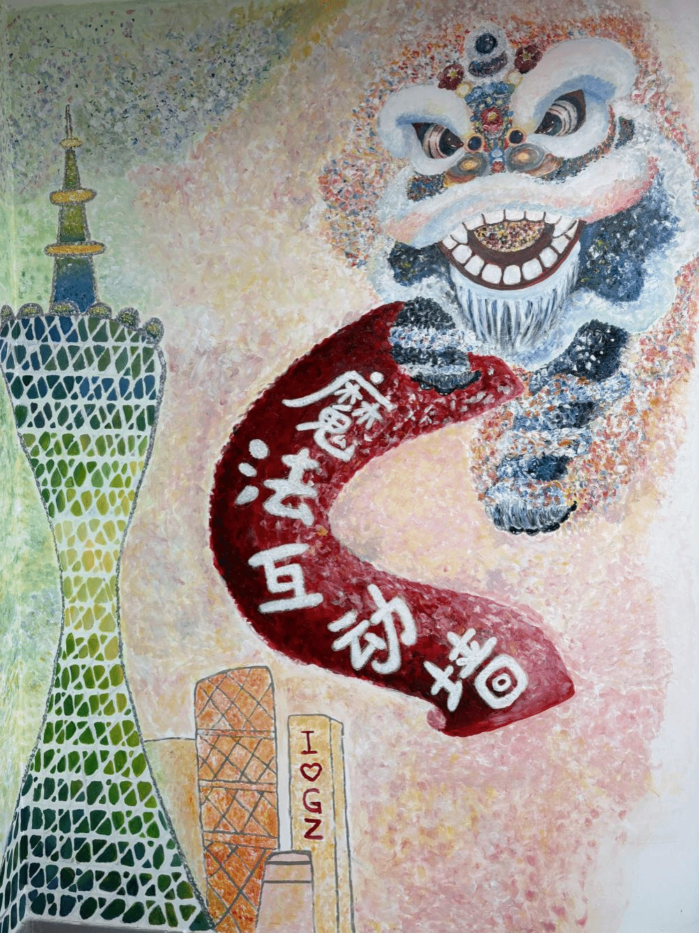 支教队员们选择广州塔和醒狮两大广东特色元素进行墙绘,为幼儿园打造了一道充满岭南风情的文化景观。广州塔作为广东的标志性建筑,寓意着粤新两地心手相牵,塔身如彩虹桥连接天山与珠江,象征广东支教大学生架设团结友爱的纽带。同时醒狮作为广东的特色,更是中国优秀传统文化的一部分,狮首昂扬象征着援疆大学生敢为人先的担当,锦羽翻飞化作民族团结的七彩绸带。