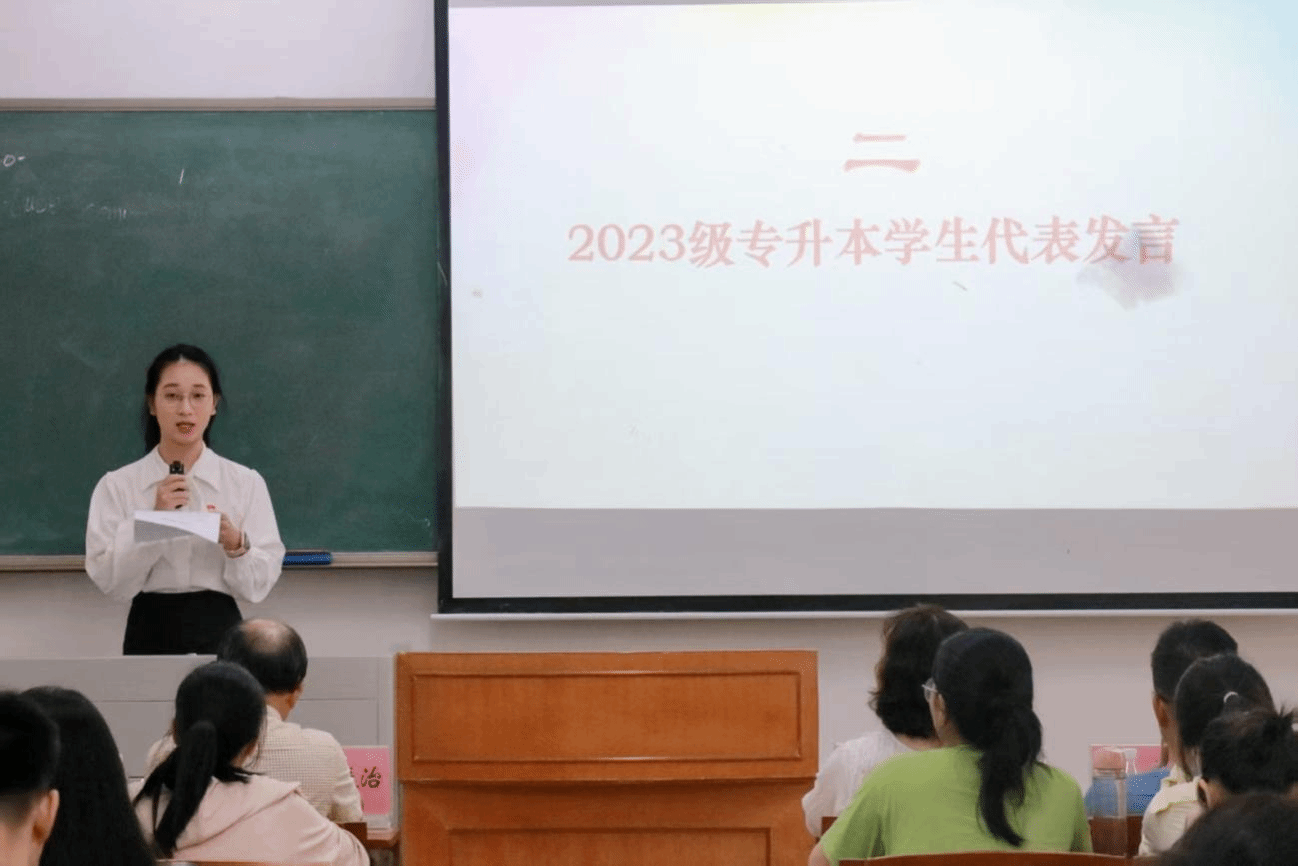 2023级专升本学生钟锐可作为新生代表发言,在发言中感谢入学报到时学院暖心的服务。她结合“厚德、明智、博学、力行”的校训,提出四点倡议:一是以“厚德”立心,筑牢信仰根基;二是以“明智”笃行,坚守理性精神;三是以“博学”赋能,追求全面发展;四是以“力行”担当,践行青春使命。她呼吁同学们珍惜大学时光,秉持校训精神,以奋斗书写青春故事,在砚园这片热土上携手共进,走向更加灿烂的明天。