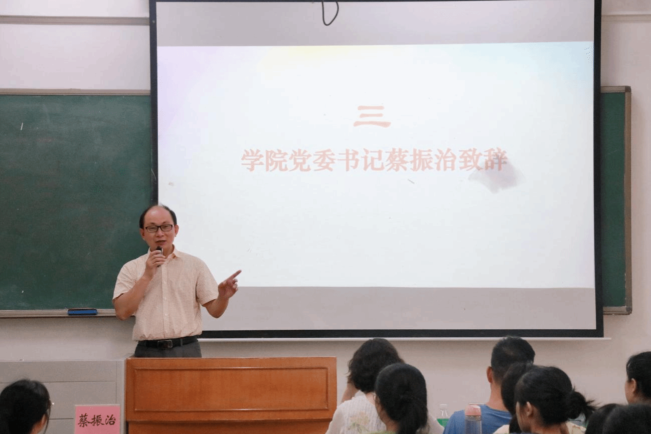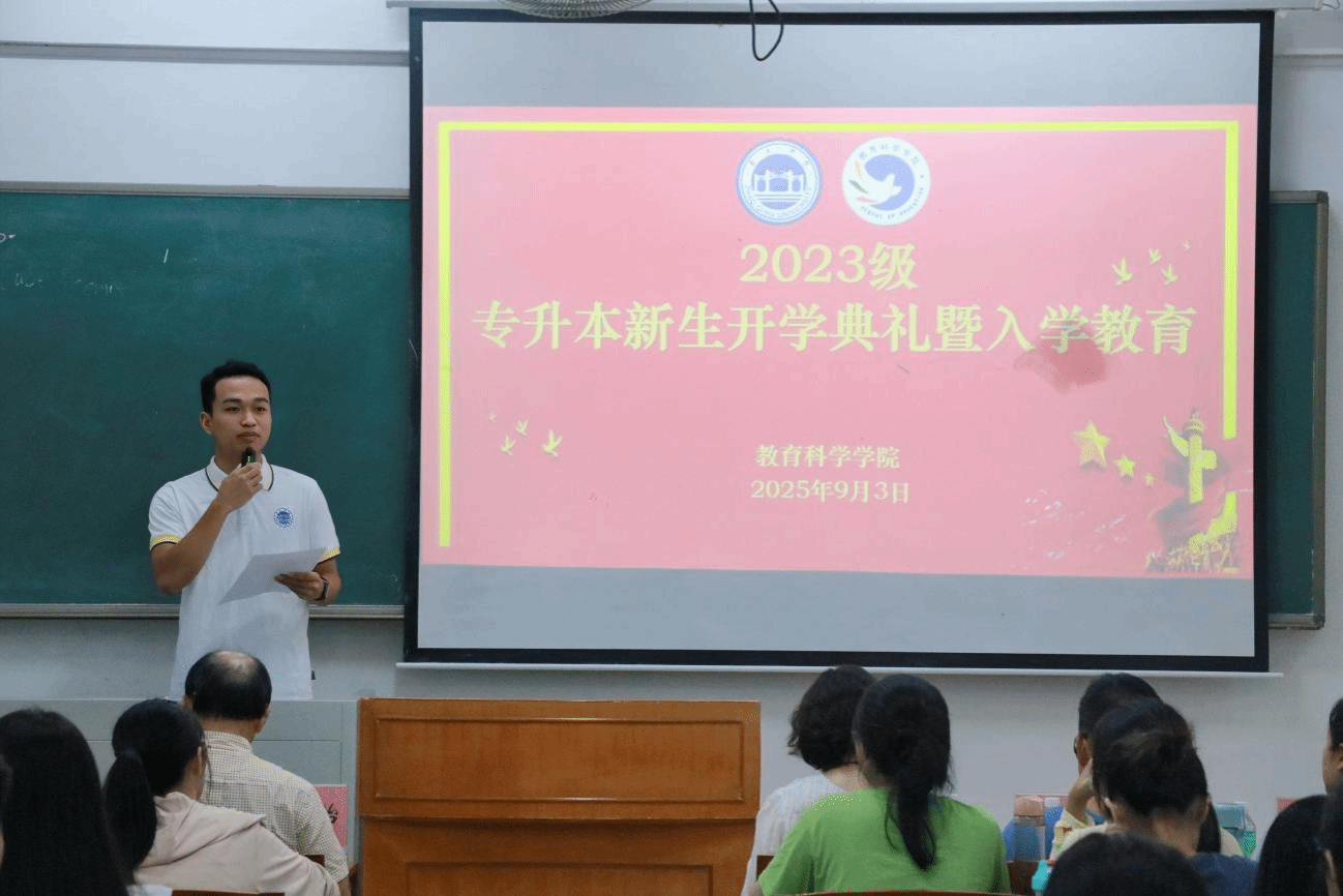 学院党委书记蔡振治为专升本新生致辞况。他以学前教育专业为例,展现学院在课程建设、师资。他介绍了学院发展历程、师资力量、所获荣誉、学生规模等大体情队伍、人才培养、学科竞赛及创新创业等方面的显著成来。同时,蔡书记对新生提出三点希望:一是心怀感恩、志存高远,珍惜时光,积极考研提升自我;二是脚踏实地、知行合一,扎实学习,参与实践,做好时间管理;三是砥砺情怀、践行施教,弘扬教育家精神,为教育事业和国家发展作贡献。最后,今年是中国人民抗日战争暨世界反法西斯战争胜利80周年,他希望新生从历史中汲取力量。