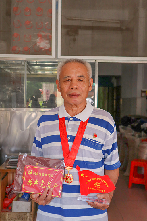 “共产党员户”标识牌在阳光下显得光彩夺目,随后在访谈中调研组成员发现,店主欧同志的柜子里摆放着“光荣在党50年”纪念章。深入访谈后我们了解到,欧同志并不是广宁本地人,退伍后服从组织分配来到了广宁县赤坑镇,如今已有40多年。谈及党员精神,他表示:“我认为,党员精神的核心在于奉献与牺牲。在战争时期能够入党的人都是有‘真材实料’的,当时战斗激烈,有一次,坦克把大石头压了,地道塌方把我们很多战友都埋了,其他受伤的战友也依然坚守在战场上,战友和医生都没有一刻停歇,党员同志应该有冲锋在前的思想觉悟……”时值党的百年华诞,收到“光荣在党50年”纪念章,欧同志对党的关怀感到十分喜悦,感谢党、感谢国家在繁荣富强的时候没有忘记老一辈的党员,对党和国家表达了自己真挚的祝福。