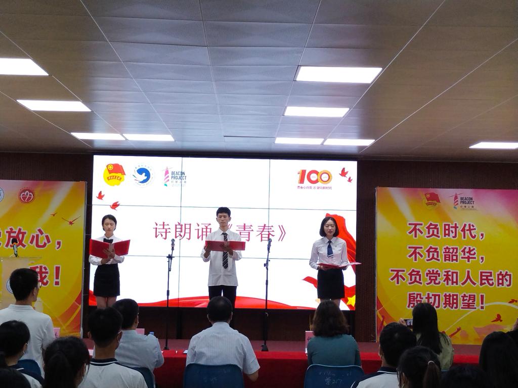 三位学生代表带来诗朗诵《青春》,声音时而婉转,时而激昂,字字铿锵,用文字和声音的力量催人奋进。师生们还通过视频回放,集体学习重温习近平总书记在庆祝中国共产主义青年团成立100周年大会上的重要讲话片断。