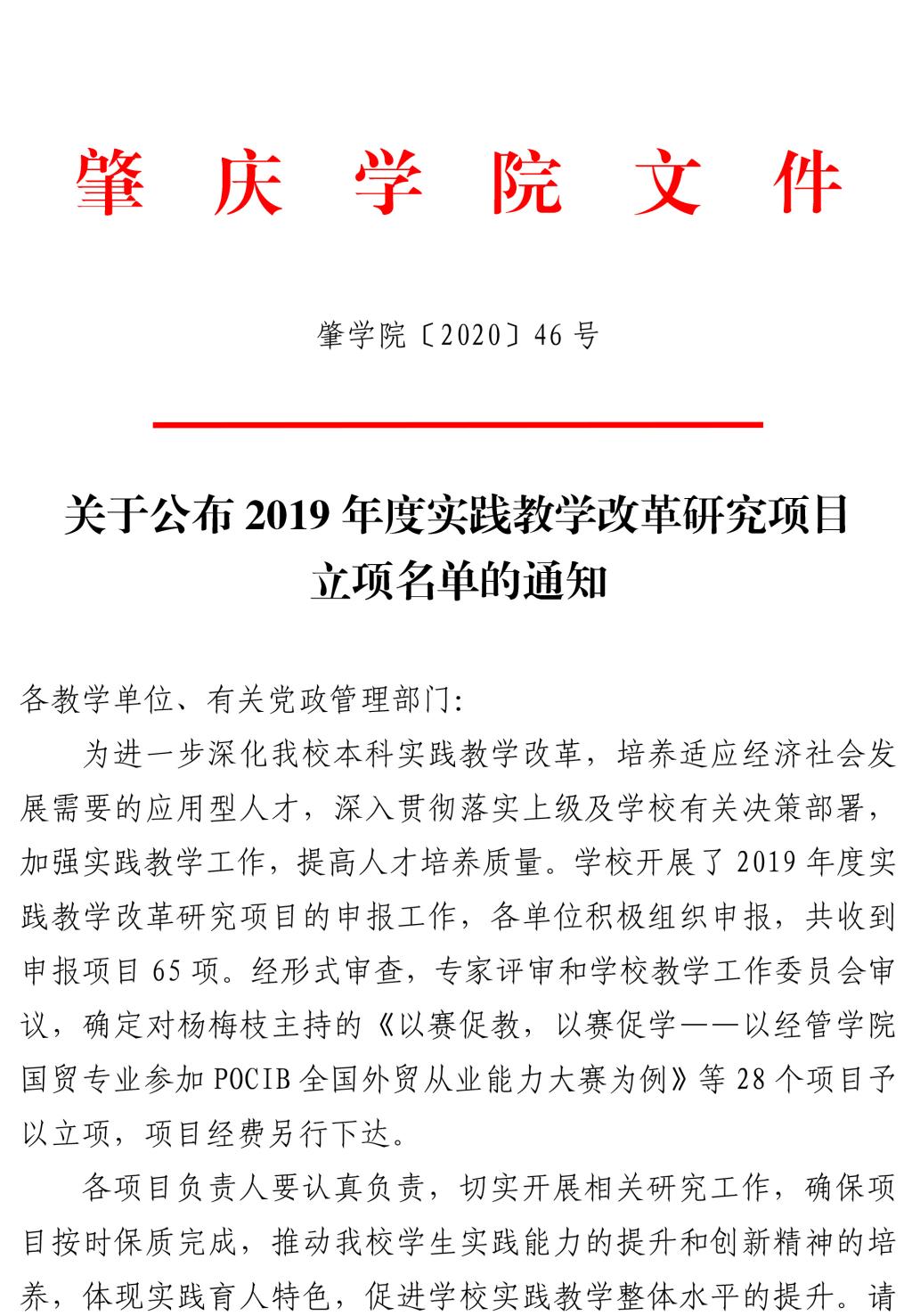 肇学院〔2020〕46号关于公布2019年度实践教学改革研究项目立项名单的通知